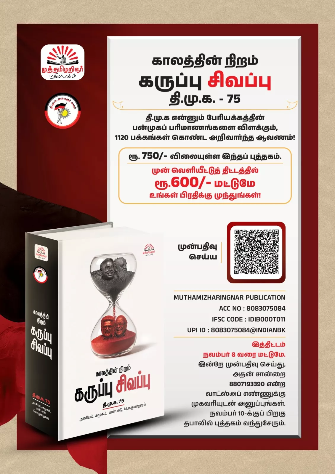 முகப்பு வெளியீடு காலத்தின் நிறம் கருப்பு சிவப்பு: தி.மு.க.-75 காலத்தின் நிறம் கருப்பு சிவப்பு: தி.மு.க.-75 காலத்தின் நிறம் கருப்பு சிவப்பு: தி.மு.க.-75 By சாகுல் அமீது 31 October 2025 முன் பதிவு செய்ய கடைசி நாள்: 08/11/2025